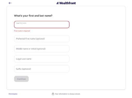 Then Wealthfront asks for personal information like legal first name and last name, middle name, and preferred first name and last name. Then the user will enter their email address and password.