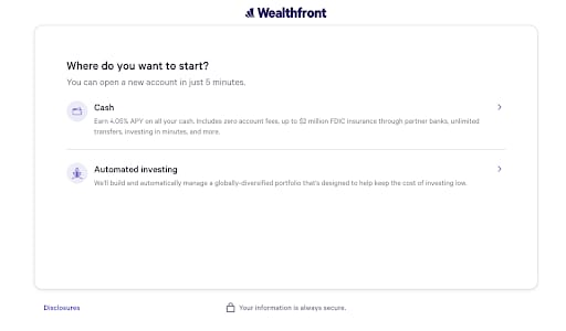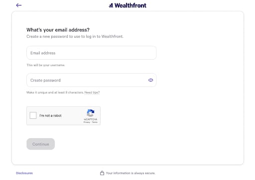 At the bottom of the form, Wealthfront assures prospects that their information is always secure.