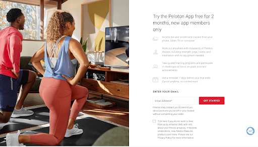 The form headline itself, Try the Peloton App free for 2 months is a call to action. Underneath it, Peloton succinctly reminds users of the benefits they’ll receive if they sign up. The image beside the form copy helps the user visualize just how easy and convenient it is to use Peloton to work out and get (or stay) fit.