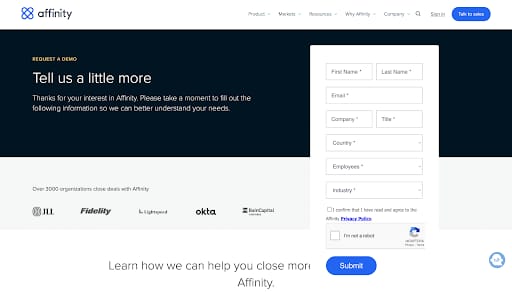 In the form copy, Affinity makes it clear that the purpose of the form is to collect data about the prospect so they can best understand their needs. Affinity asks for the first name, last name, email address, company, title, employees, and industry of the prospect. This information will help them figure out the features of Affinity that the prospect might be interested in so that they can capitalize on that during the demo.