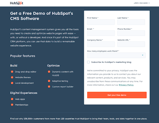 On the left side of the page, the form copy briefly explores the popular features of HubSpot CMS. This helps the prospect put things into perspective and decide if HubSpot CMS offers features that they truly need in their work operations.