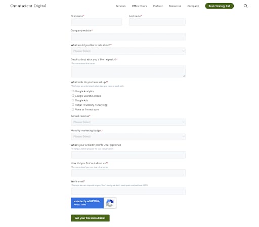The forms ask prospects to provide details about what they need help with, tools they have set up, annual revenue, and monthly marketing budget. This information helps the team at Omniscient Digital know if what a prospect needs is in their wheelhouse and if the budget is something they’d be able to work with.