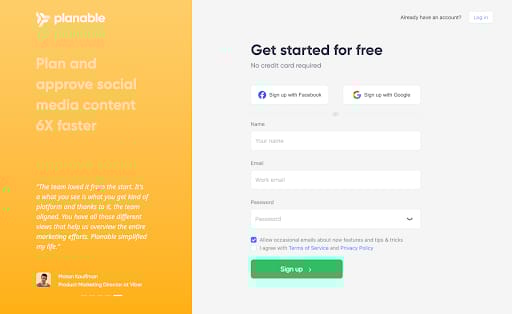 Just like Jasper.ai, signing up for Planable is simple. There are form fields for the name, work email address, and password. There are also options for users to sign up with Facebook and Google.