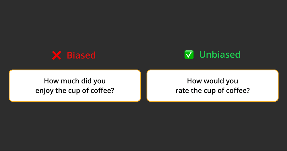 A leading question uses phrasing that suggests an emotion, experience, or any outcome or thought that the user may have had. In the coffee example above, participants end up thinking about how much they enjoyed the coffee instead of considering their own subjective experience. Here’s another example: