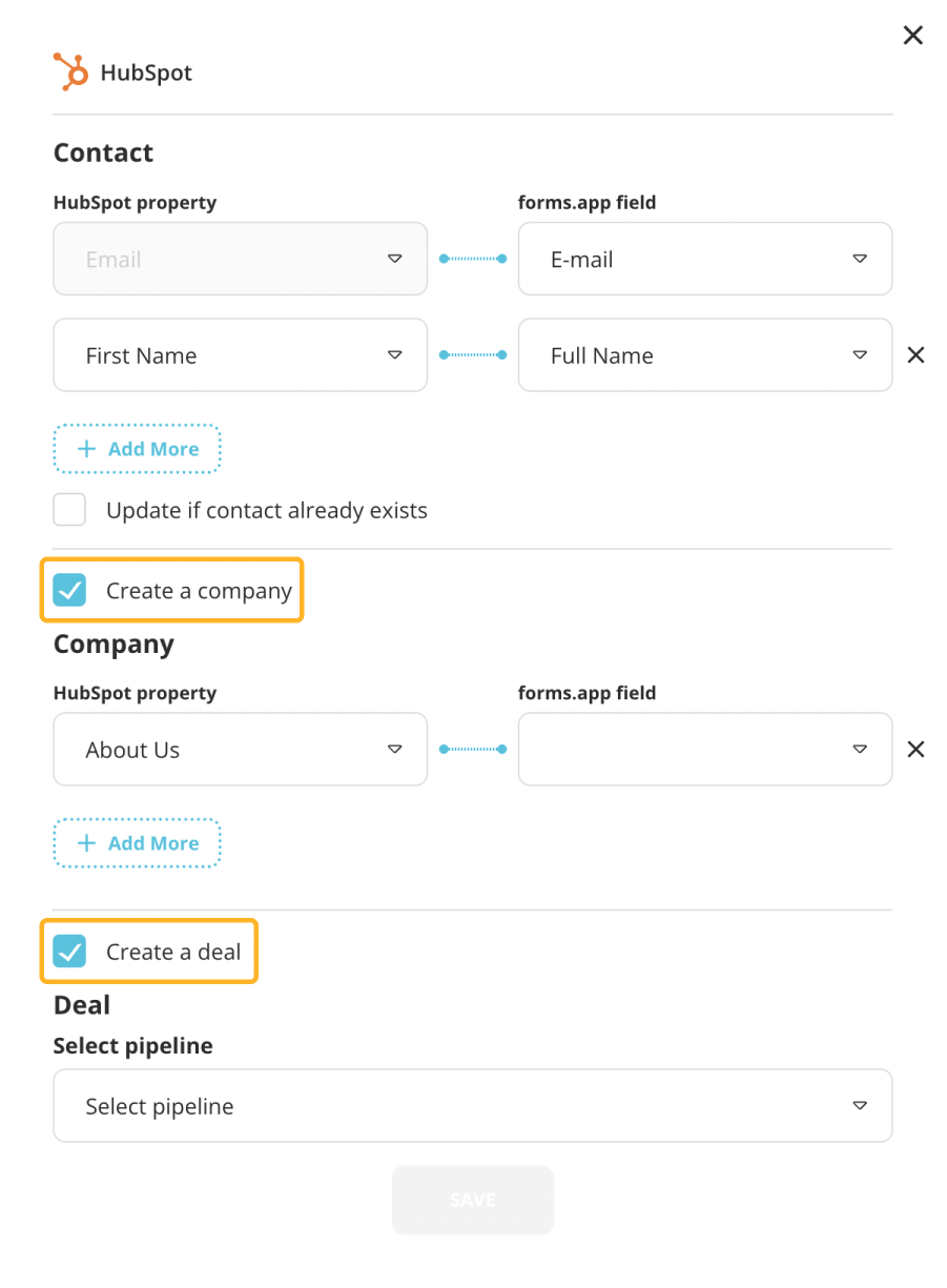 6 - Enable adding companies or deals and repeat the pairing up process if you are going to use this integration for these purposes: