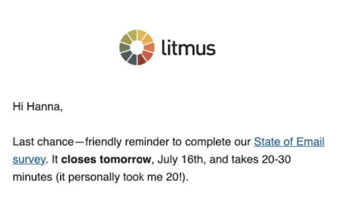 Keep reminder emails short, friendly, and light. Emphasize the survey link and accompany it with an effective CTA. You can shorten or even omit other survey invitation email components this time.