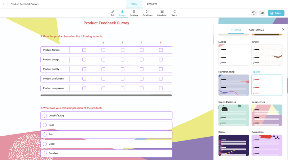 4 - Choose the design: Then, edit the design of the survey. You can choose the colors according to the colors of your company or add a background image.