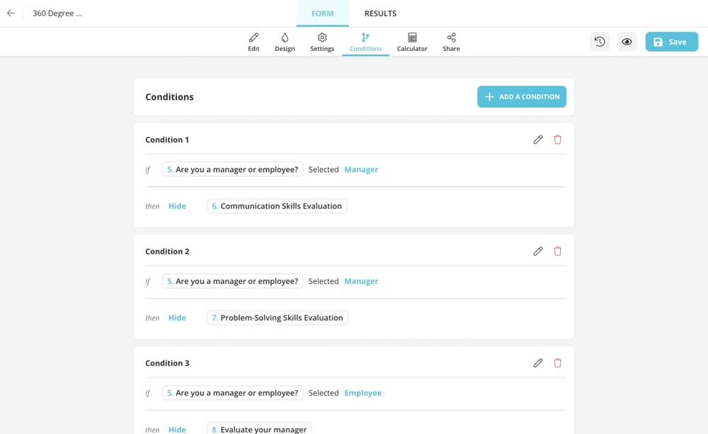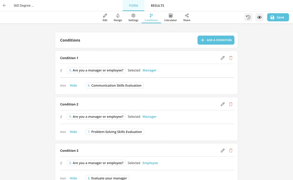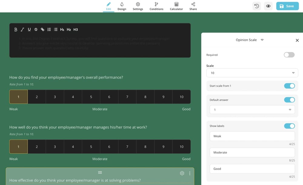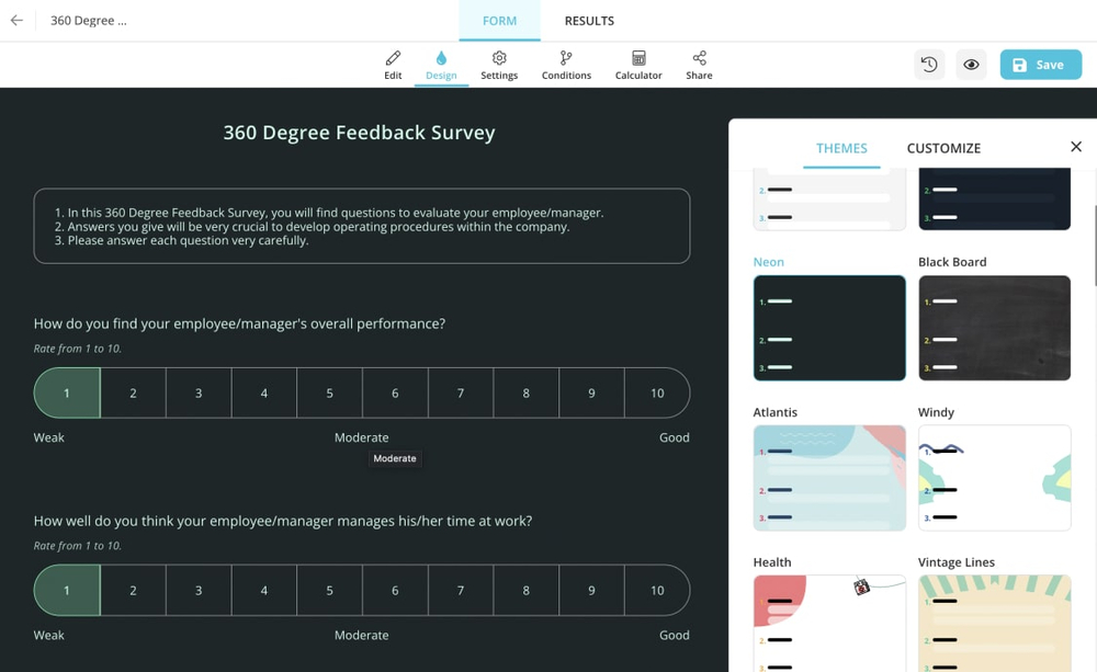 Adjust your general form settings. There are numerous feature forms.app offers. You can use the calculator feature for automating the scoring process. You also have an access to statistics page to help you analyze the data. That’s it; now you can share your feedback form and get instant results.