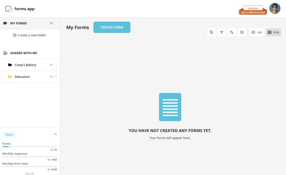 Once you have created your forms.app account, simply click the create form button and start your forms.app journey. To learn the basics about creating a form on forms.app.