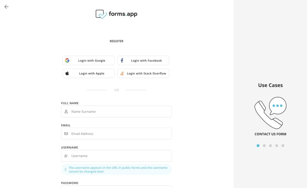 Open the forms.app page and find the register button on the top right corner. Once you have opened the register page, you will have many options to follow.