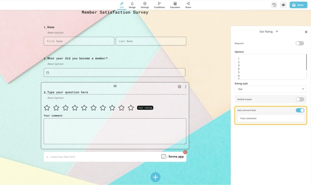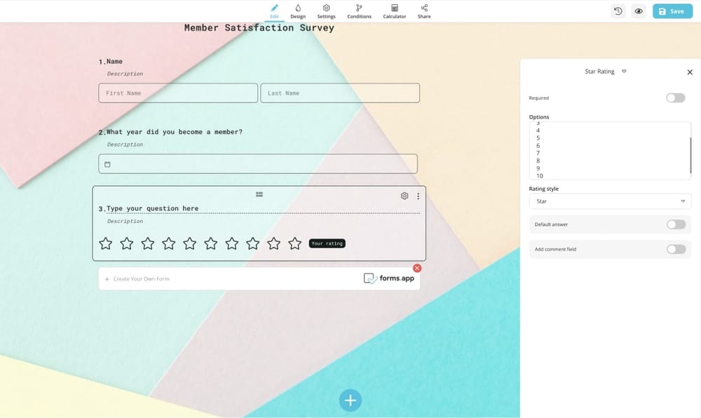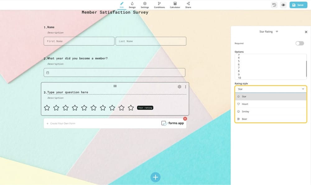 Increase the return of the survey by adjusting the conditions provided by forms.app to its users. Changing the condition settings allows you to add or remove new questions based on users' answers. If the user scores between 0-6, you can ask a question where users can share their suggestions