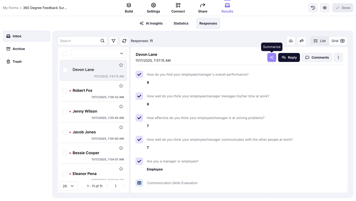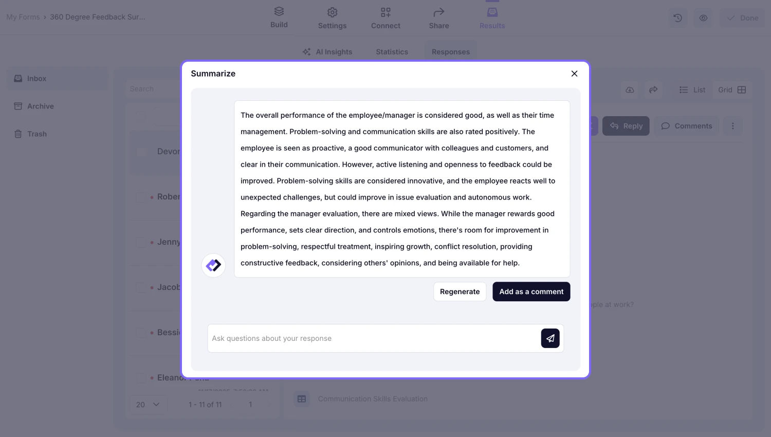 Some forms are long and going thorough each answer one by one can be tedious. Using the summarize button will simply give you all the essential information about the response. Plus, you can continue the conversation by asking follow-up questions.