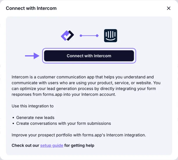 Intercom is a very popular customer service platform that allows instant communication with customers and other site visitors. By integrating your forms with Intercom, you will be able to automatically create contacts and conversations with form responses.
