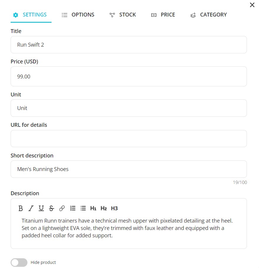 - Here you will see all the fields that you need to fill in for a complete product. Title, price, description, etc.