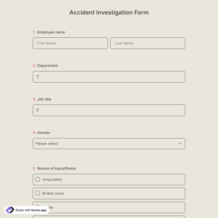 If you are investigating an accident in a workplace, you can use our accident investigation form template. Creating a fully functional investigation form using our template will help collect all the necessary information. You do not need any coding skills to craft your form!