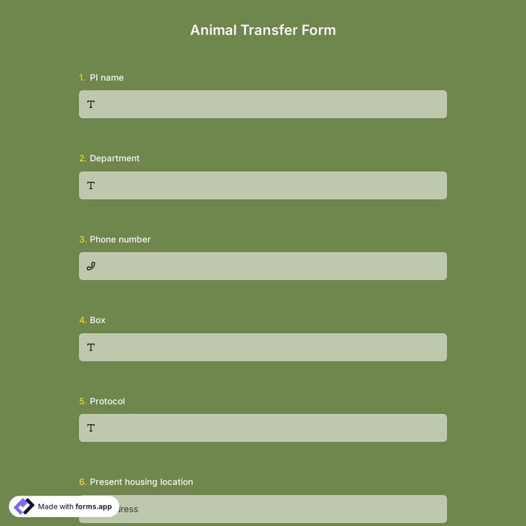 Do you want to receive animal transfer requests more regularly and online? Thanks to the animal transfer form template, you can create and customize your own form in minutes without having to write code. Get started to build forms with forms.app!