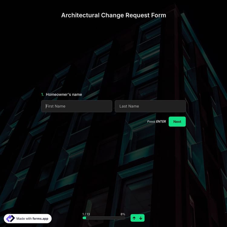 If you are receiving requests from citizens looking to make an architectural change in their residential site, use our online architectural change request form template and start receiving requests easily and time-efficiently. Our templates are free and ready to use; you do not need any coding skills!