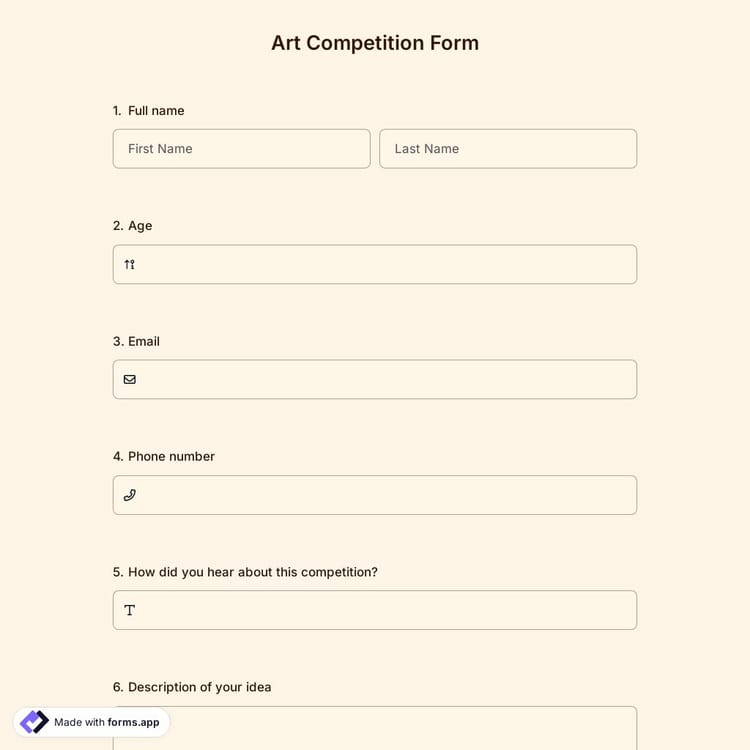 Art competitions are consent where candidates showcase their talents. Use forms.app’s art competition form template to gather comprehensive information about the candidates applying for these competitions. You can customize the form and create eye-catching forms. Go to forms.app's template page to access all application forms for free.