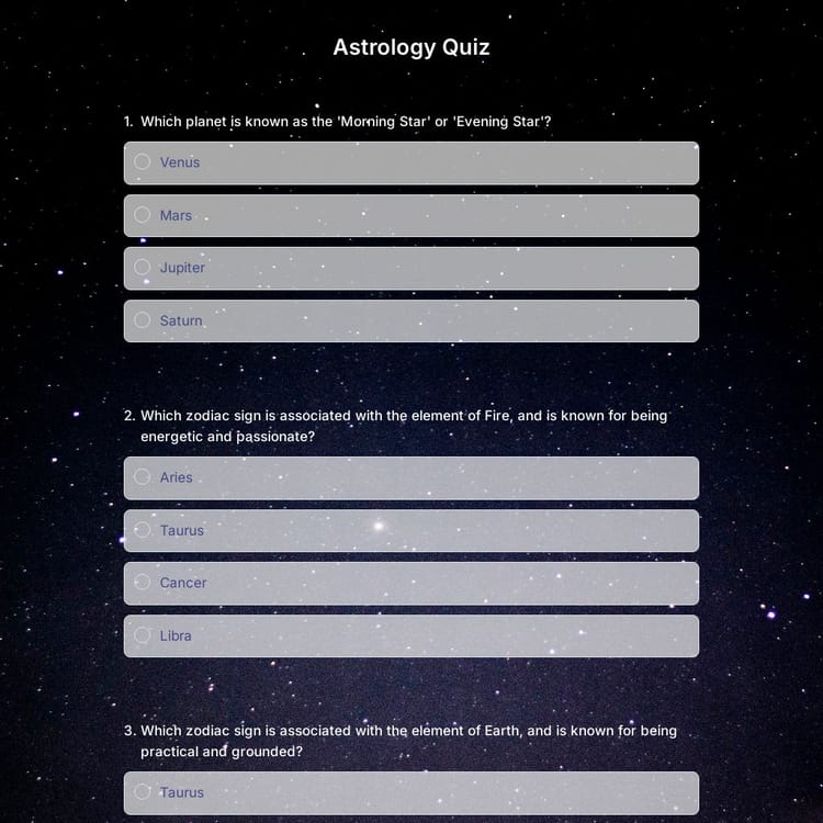This astrology quiz template allows you to create a unique quiz that reflects zodiac signs, planetary traits, and cosmic patterns. Start customizing and sharing your astrology quiz in minutes—no coding needed!