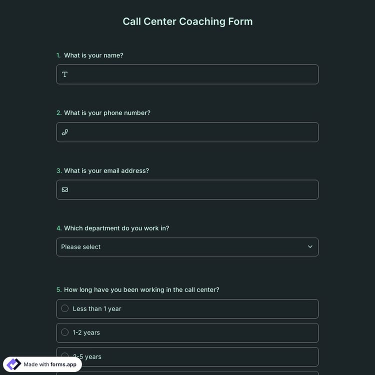 The call center coaching form is useful for assessing and improving the agent’s call performance during coaching sessions. Managers or those providing call center training or coaching can use this evalutaion form to identify areas for improvement. As a result, you can statistically evaluate the form data and have a more effective form experience with reporting tools!