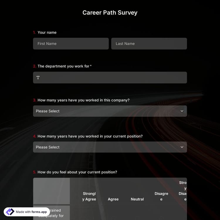 Whether it is for students or employees, a career path survey helps people learn about their personality traits. This will show which jobs are better suited for them. In companies, these personality tests and employee surveys can lead to employee training programs and increase the growth opportunities of the company. Get started with the free career path survey template on forms.app now!