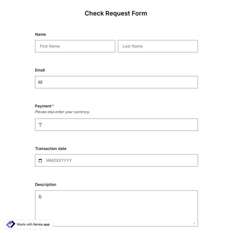 - Provide a great layout for the request: forms.app’s check request form template will provide the perfect layout for well-organized check requests. This way, you will find what you are looking for more easily, thus reducing the overall review time.