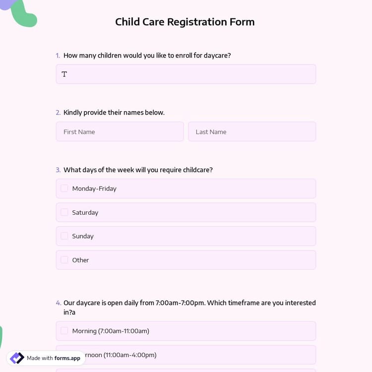 An online childcare registration form helps parents apply for childcare services. If both parents work, leaving the child is at a daycare center is always among the best options. Create your form by choosing forms.app’s child care registration form template and start reviewing the child care applications today!