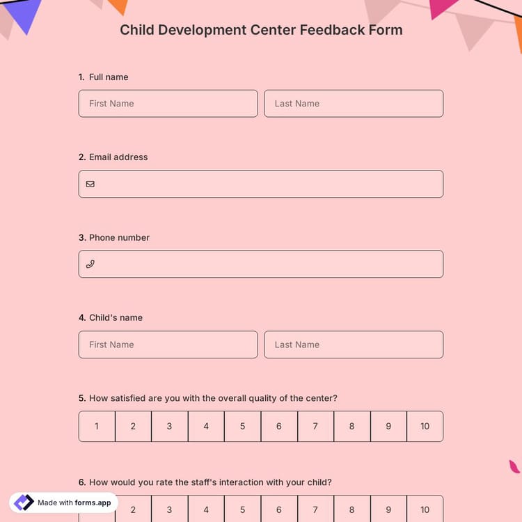 Online forms help organize feedback for your child development programs. This free child development center feedback form template simplifies collecting essential feedback from parents. Use forms.app’s free template to improve your services for every child in your care.