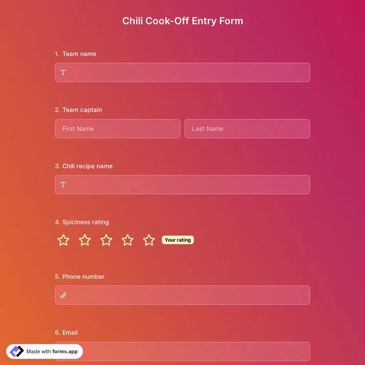 To create a chili cook-off entry form, the organizer will need to decide on the format (such as an online form or a printable document). You can find registration forms on our website and use them for free, and determine what information they want to collect from participants.