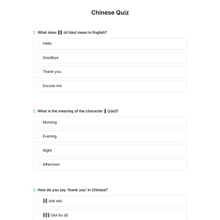 A Chinese quiz is a set of interactive questions designed to assess and enhance knowledge of the Chinese language and culture. It can cover various topics such as vocabulary, grammar, pronunciation, and cultural facts. This type of quiz is perfect for students, teachers, and language enthusiasts who want a practical way to measure their progress or deepen their understanding of Chinese culture.