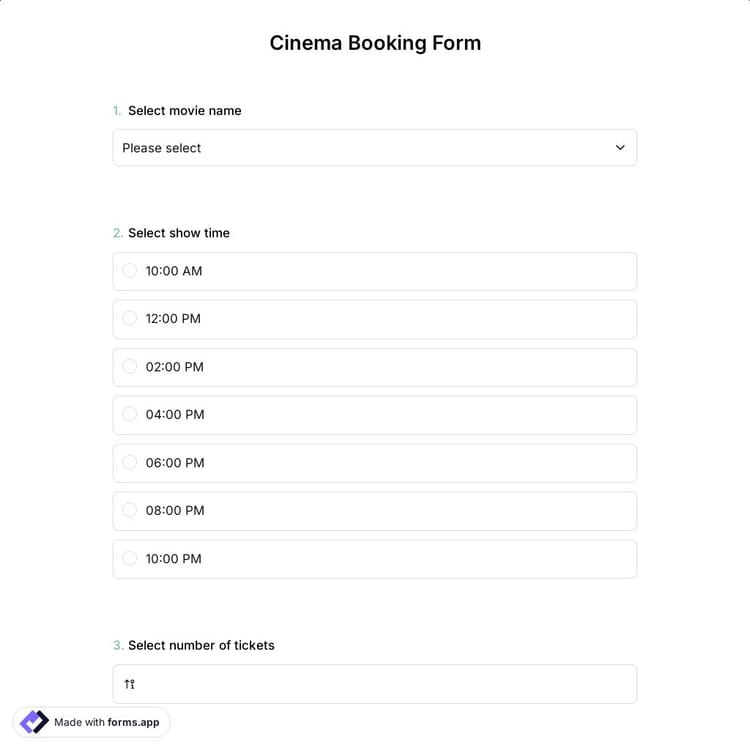 Booking forms can be used for a variety of purposes, such as booking hotel rooms, renting cars, or making restaurant reservations. They are also commonly used to schedule appointments for services such as hair appointments, massages, and so on. Additionally, you can build complex forms with conditional logic or accept payments on forms.app. This will make your forms more functional than ever and tailored for all customer types.