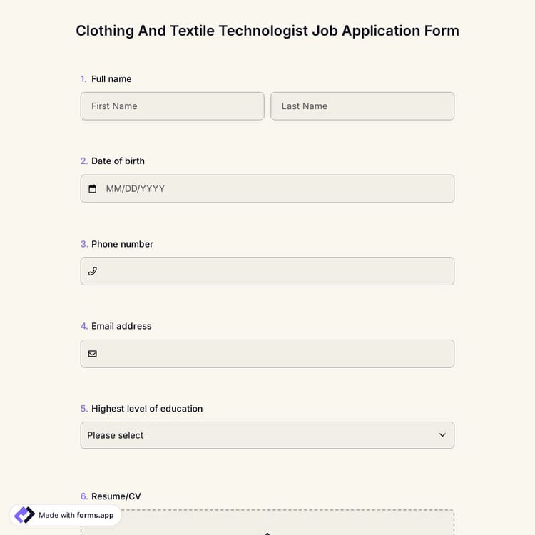 View this clothing and textile technologist job application form and click on "use template" after making sure this is what you are looking for.