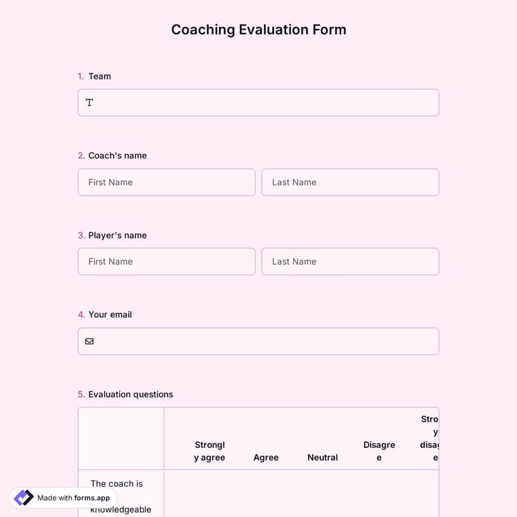 Coaches and mentors often use the coaching evaluation form to learn more about their clients' ideas and thoughts. This evaluation form template contains questions that ask whether the coach has the skills to train students, both technically and spiritually. You can also prepare and fill out this form on your mobile devices by downloading the forms.app application.