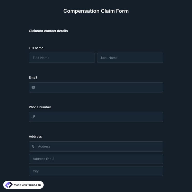 If you are an insurance agent or public official working to receive compensation claims from customers for their loss, forms.app offers you an online compensation form template to create your form and start receiving claims. It is online, free of charge, and comes with many customization options. No coding skill is necessary!