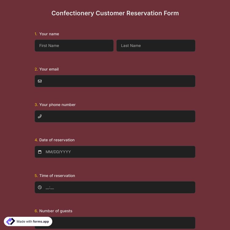 A confectionery customer reservation form helps sweet shops and bakeries take orders for cakes, pastries, and other treats in advance. With this easy-to-use template from forms.app, you can collect reservation details smoothly and manage production timelines better. Click “Use Template” to start today!