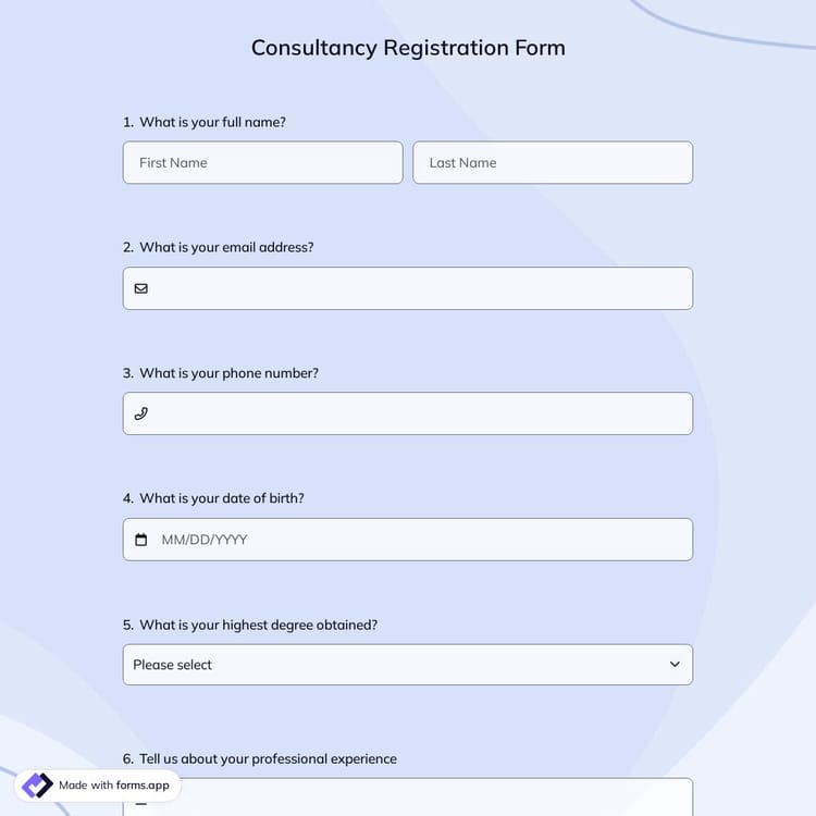A proper registration form for consultancy is crucial. If you need a specialized consultancy registration form, you can use forms.app with its easy-to-use features for free. Easily add your own questions to your document based on your need, you can start today!