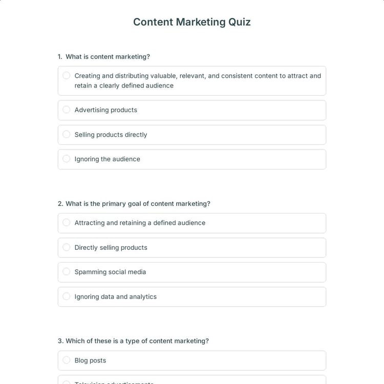 A content marketing quiz is an interactive tool designed to test and educate individuals on key concepts of content marketing. This type of quiz can cover topics like SEO, social media strategies, audience targeting, and analytics. It is perfect for professionals, students, or marketers aiming to assess their knowledge or enhance their skills.