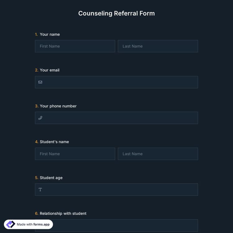 If you provide counseling services in your own office or in a high school, it is best to have a counseling referral form. This way, the teachers and other students will be able to want your help with another student. Start creating your form now with forms.app’s counseling referral form template!