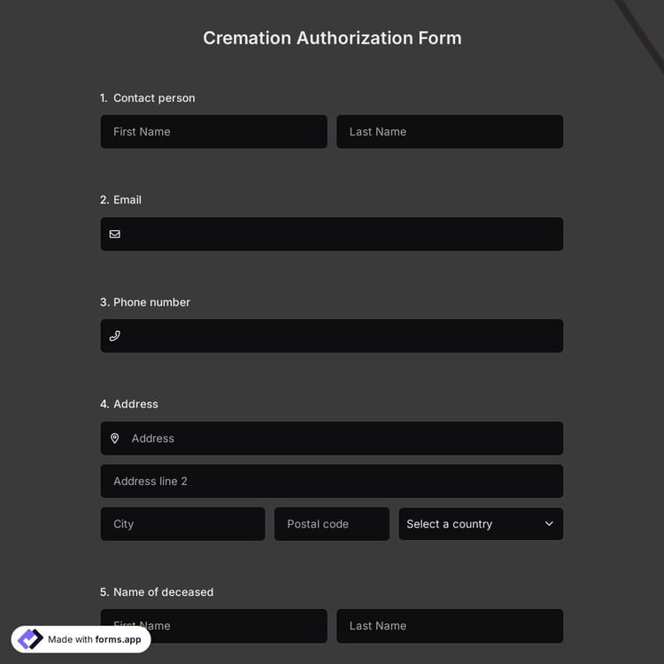 As a crematorium business owner, you need to have a cremation authorization form for each and every client. The problem is that this can be time-consuming and tedious to manage. Luckily, you can use an online cremation authorization form that will automate the process and make it easier for you. With forms.app, you can quickly and easily create and edit cremation authorization forms.