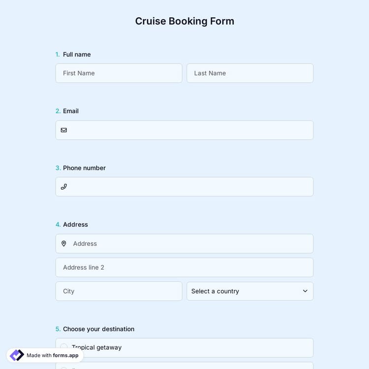 Cruise companies and travel agencies can use this free cruise booking form template to create a form in less than a minute. It will organize the way you gather passenger information. You can start building your form immediately by clicking on the “use template” button below!