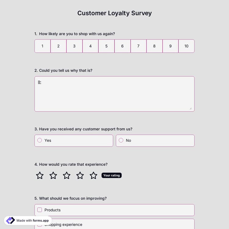The customer loyalty survey is a type of customer satisfaction questionnaire used to measure customers’ loyalty to your brand and products. It aims to measure the customers’ recommendation your brand rate, wheter they will repurchase your product, and their confidence in your brand. You can create your customer loyalty survey template with just a few clicks on forms.app.