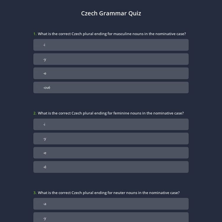 A Czech grammar quiz template is a pre-designed tool that lets educators and learners create quizzes focusing on Czech grammar. Whether you’re teaching a language class or learning Czech independently, this template allows you to create tests that include topics like verb conjugation, cases, and syntax, all tailored to your audience's level.