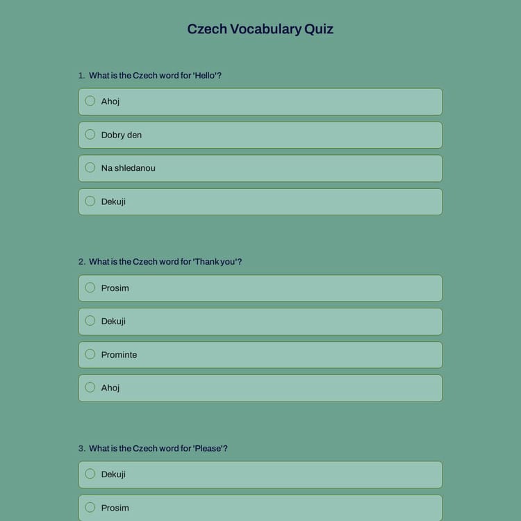 With this free Czech vocabulary quiz form template, you can easily create engaging quizzes to help learners expand their Czech vocabulary and track their progress. Open this customizable template and start building your quiz in just minutes!