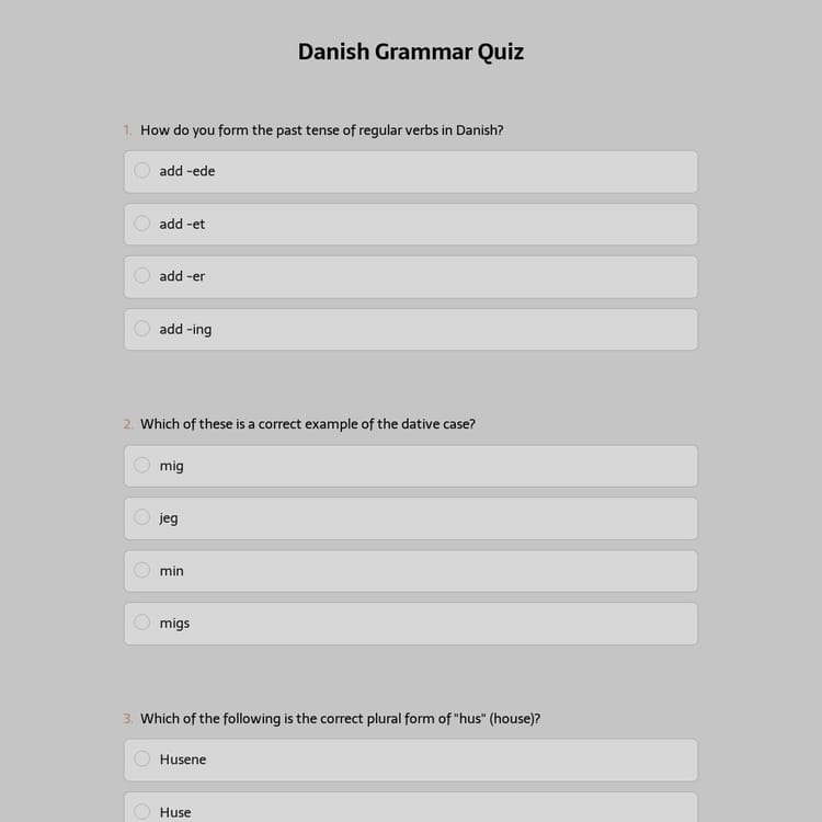 A Danish grammar quiz is an online tool designed to evaluate and enhance knowledge of Danish grammar rules. It includes questions on sentence structure, verb conjugation, and vocabulary. Use this ready-made template to simplify your quiz creation process and tailor it to your audience’s needs.