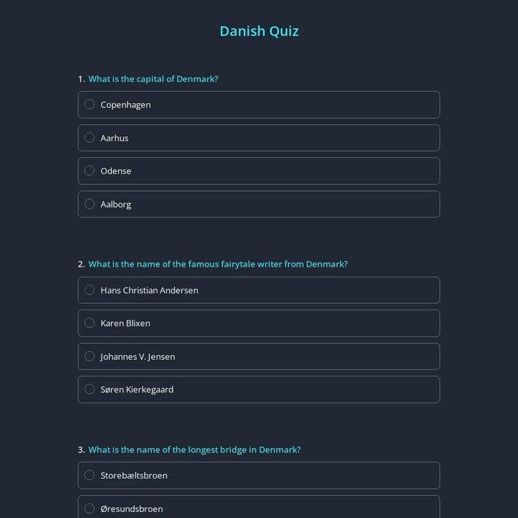 A Danish quiz template is a pre-designed online quiz that can be customized to include questions about Denmark’s rich cultural heritage, iconic landmarks, or even its fascinating language. Whether for educational purposes or casual fun, this template simplifies creating an interactive quiz that anyone can enjoy.