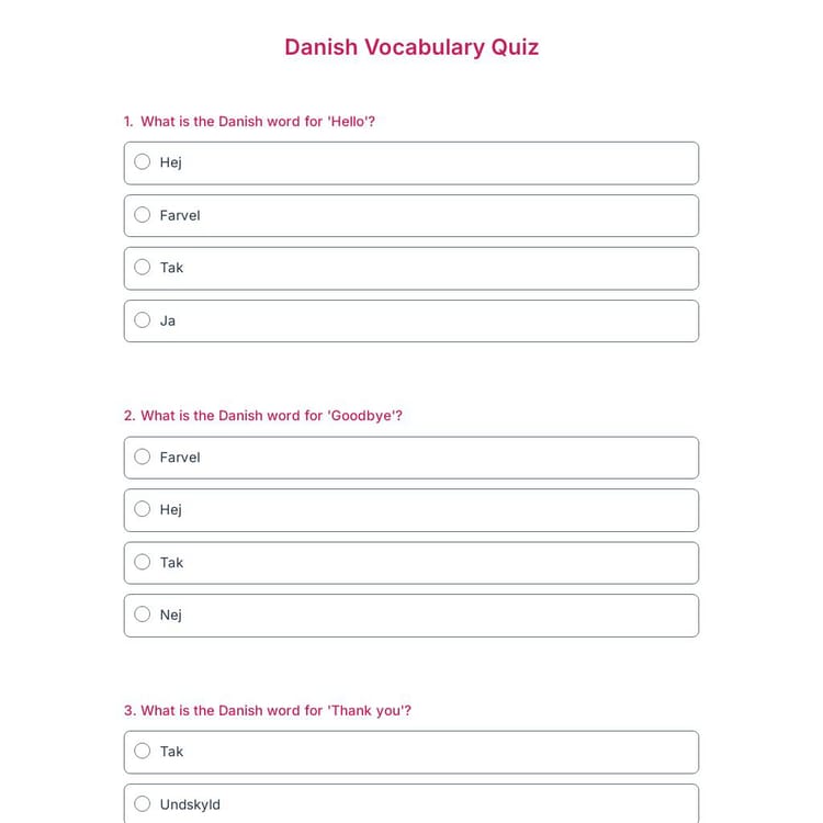 This Danish vocabulary quiz template is perfect for learners, teachers, or language enthusiasts who want a fun and interactive way to practice. Start building your quiz now with this customizable template!