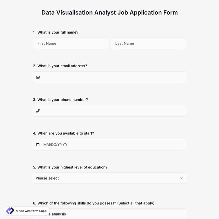 View this data visualisation analyst job application form and click on "use template" after making sure this is what you are looking for.