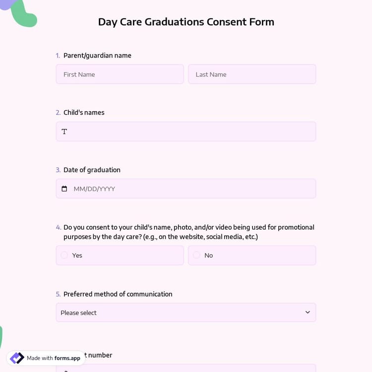 A daycare graduation consent form is a digital document designed to obtain guardians’ authorization for participation in graduation activities. It may cover permissions for photography, media sharing, or additional ceremonies. This form helps streamline communication between daycare staff and families.