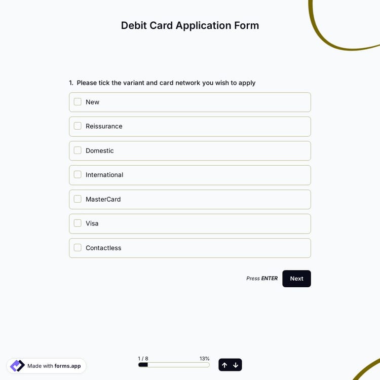 If you are looking for a debit card application form for your bank, forms.app is the most suitable form builder for you. You can create your form in a very short time without any coding knowledge. Start using the debit card application form template and proceed to the edit page.