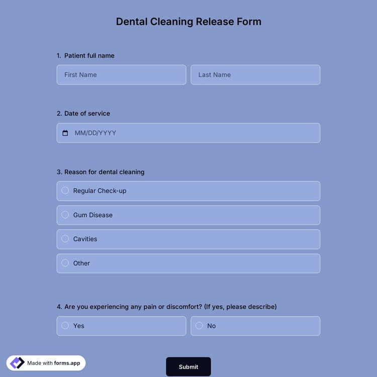 A dental cleaning release form serves as a legal agreement between a dental office and its patients. It provides clear information about the cleaning procedure, potential risks, and post-treatment care, ensuring patients give their informed consent. By using an online form, dentists can collect and store these agreements securely and efficiently.